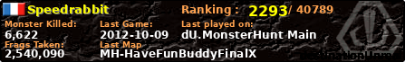 Speedrabbit | | PlayerID: | 10012 | | Overall MHT: | 2,540,090 | | Overall Deaths: | 993 | | Overall Suicides: | 3 | | Overall TeamKills: | 8 | | Overall Distance traveled: | 891km | | Overall Time Spend on Server: | 02days 15h 12m 55s | | Maps Played: | 237 | | Firstgame: | 2012-06-28 16:33:41 | | LastGame: | 2012-10-09 17:30:05 | | Player Ranking Place: | 2293 | | Used Playernames: | Speedrabbit