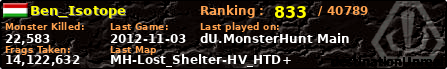 Ben_Isotope | | PlayerID: | 10191 | | Overall MHT: | 14,122,632 | | Overall Deaths: | 1122 | | Overall Suicides: | 3 | | Overall TeamKills: | 16 | | Overall Distance traveled: | 1,161km | | Overall Time Spend on Server: | 04days 06h 07m 42s | | Maps Played: | 369 | | Firstgame: | 2012-07-13 14:51:19 | | LastGame: | 2012-11-03 01:16:45 | | Player Ranking Place: | 833 | | Used Playernames: | Ben_Isotope Beni_de_Vito