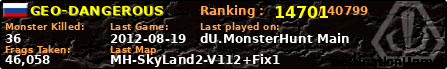 | Server | Map | LastGame | Score | Teamscore | Monsterleft | Deaths | Suicides | TKs | Distance | Playtime | |