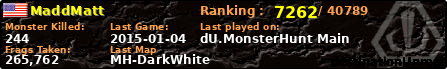MaddMatt | | PlayerID: | 11072 | | Overall MHT: | 265,762 | | Overall Deaths: | 22 | | Overall Suicides: | 0 | | Overall TeamKills: | 0 | | Overall Distance traveled: | 38km | | Overall Time Spend on Server: | 00days 03h 15m 12s | | Maps Played: | 23 | | Firstgame: | 2012-09-07 01:33:56 | | LastGame: | 2015-01-04 19:01:13 | | Player Ranking Place: | 7262 | | Used Playernames: | MaddMatt