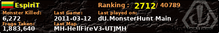 EspiriT | | PlayerID: | 1341 | | Overall MHT: | 1,883,640 | | Overall Deaths: | 783 | | Overall Suicides: | 1 | | Overall TeamKills: | 23 | | Overall Distance traveled: | 388km | | Overall Time Spend on Server: | 01days 08h 36m 17s | | Maps Played: | 297 | | Firstgame: | 2010-09-16 15:42:38 | | LastGame: | 2011-03-12 21:01:43 | | Player Ranking Place: | 2712 | | Used Playernames: | EspiriT Peace