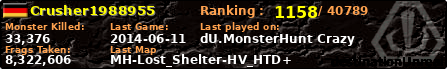 Crusher1988955 | | PlayerID: | 16241 | | Overall MHT: | 8,322,606 | | Overall Deaths: | 531 | | Overall Suicides: | 6 | | Overall TeamKills: | 0 | | Overall Distance traveled: | 735km | | Overall Time Spend on Server: | 02days 05h 06m 18s | | Maps Played: | 134 | | Firstgame: | 2014-02-15 13:44:04 | | LastGame: | 2014-06-11 20:30:59 | | Player Ranking Place: | 1158 | | Used Playernames: | Crusher1988955 Crusher1988