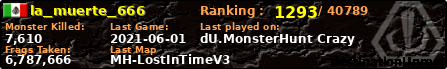 la_muerte_666 | | PlayerID: | 17280 | | Overall MHT: | 6,787,666 | | Overall Deaths: | 585 | | Overall Suicides: | 77 | | Overall TeamKills: | 10 | | Overall Distance traveled: | 495km | | Overall Time Spend on Server: | 01days 19h 37m 50s | | Maps Played: | 144 | | Firstgame: | 2014-06-03 03:03:33 | | LastGame: | 2021-06-01 20:03:51 | | Player Ranking Place: | 1293 | | Used Playernames: | la_muerte_666 Eltroll64634c MUERTE_666 -=Rp*killer_speed despasito_ll desasito_II lamuerte_666 lamuerte666 redi_for098 nito_0078 garfiel_el_gato =(V)=killer_speed:)