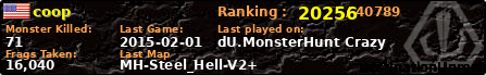 | Server | Map | LastGame | Score | Teamscore | Monsterleft | Deaths | Suicides | TKs | Distance | Playtime | |