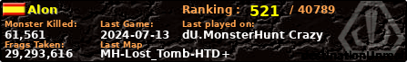 Alon | | PlayerID: | 1924 | | Overall MHT: | 29,293,616 | | Overall Deaths: | 4653 | | Overall Suicides: | 41 | | Overall TeamKills: | 30 | | Overall Distance traveled: | 3,611km | | Overall Time Spend on Server: | 17days 02h 49m 58s | | Maps Played: | 1690 | | Firstgame: | 2010-10-25 23:51:59 | | LastGame: | 2024-07-13 22:43:48 | | Player Ranking Place: | 521 | | Used Playernames: | Alon