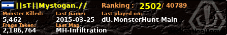 ||sT||Mystogan.// | | PlayerID: | 19614 | | Overall MHT: | 2,186,764 | | Overall Deaths: | 433 | | Overall Suicides: | 28 | | Overall TeamKills: | 7 | | Overall Distance traveled: | 318km | | Overall Time Spend on Server: | 00days 23h 26m 45s | | Maps Played: | 60 | | Firstgame: | 2015-01-29 02:41:37 | | LastGame: | 2015-03-25 14:40:21 | | Player Ranking Place: | 2502 | | Used Playernames: | ||sT||Mystogan.// ||sT||Mystogan.//10%