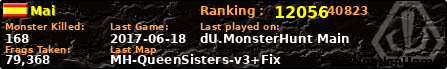 | Server | Map | LastGame | Score | Teamscore | Monsterleft | Deaths | Suicides | TKs | Distance | Playtime | |