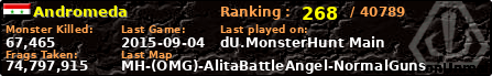 Andromeda | | PlayerID: | 20547 | | Overall MHT: | 74,797,915 | | Overall Deaths: | 2204 | | Overall Suicides: | 55 | | Overall TeamKills: | 14 | | Overall Distance traveled: | 2,882km | | Overall Time Spend on Server: | 13days 22h 55m 43s | | Maps Played: | 793 | | Firstgame: | 2015-05-02 22:38:12 | | LastGame: | 2015-09-04 21:19:39 | | Player Ranking Place: | 268 | | Used Playernames: | Andromeda Beauty_Sniper Ultra_Girl Karla_Khooly Lois_Lain .Zenobia. .Krallita. Karly