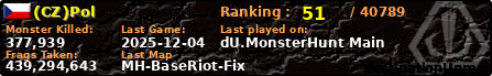(CZ)Pol | | PlayerID: | 20993 | | Overall MHT: | 439,294,643 | | Overall Deaths: | 10998 | | Overall Suicides: | 21 | | Overall TeamKills: | 135 | | Overall Distance traveled: | 16,027km | | Overall Time Spend on Server: | 61days 22h 08m 34s | | Maps Played: | 4044 | | Firstgame: | 2015-06-10 13:23:19 | | LastGame: | 2025-12-04 16:18:17 | | Player Ranking Place: | 51 | | Used Playernames: | (CZ)Pol Pepino Newman