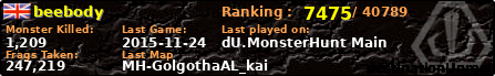 beebody | | PlayerID: | 22090 | | Overall MHT: | 247,219 | | Overall Deaths: | 114 | | Overall Suicides: | 2 | | Overall TeamKills: | 2 | | Overall Distance traveled: | 75km | | Overall Time Spend on Server: | 00days 05h 36m 41s | | Maps Played: | 20 | | Firstgame: | 2015-09-27 19:51:56 | | LastGame: | 2015-11-24 13:09:43 | | Player Ranking Place: | 7475 | | Used Playernames: | beebody knockknock joju usmell meme