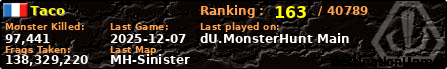Taco | | PlayerID: | 22630 | | Overall MHT: | 138,329,220 | | Overall Deaths: | 502 | | Overall Suicides: | 0 | | Overall TeamKills: | 12 | | Overall Distance traveled: | 2,704km | | Overall Time Spend on Server: | 12days 03h 31m 55s | | Maps Played: | 980 | | Firstgame: | 2015-11-13 06:01:58 | | LastGame: | 2025-12-07 18:16:08 | | Player Ranking Place: | 163 | | Used Playernames: | Taco OVH