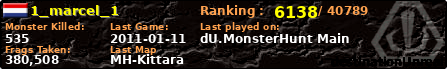 1_marcel_1 | | PlayerID: | 2379 | | Overall MHT: | 380,508 | | Overall Deaths: | 111 | | Overall Suicides: | 16 | | Overall TeamKills: | 0 | | Overall Distance traveled: | 73km | | Overall Time Spend on Server: | 00days 05h 07m 28s | | Maps Played: | 20 | | Firstgame: | 2010-12-17 01:36:15 | | LastGame: | 2011-01-11 00:47:28 | | Player Ranking Place: | 6138 | | Used Playernames: | 1_marcel_1