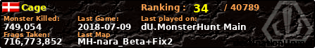 Cage | | PlayerID: | 26302 | | Overall MHT: | 716,773,852 | | Overall Deaths: | 5662 | | Overall Suicides: | 291 | | Overall TeamKills: | 37 | | Overall Distance traveled: | 12,828km | | Overall Time Spend on Server: | 47days 09h 18m 26s | | Maps Played: | 3673 | | Firstgame: | 2016-08-05 11:41:16 | | LastGame: | 2018-07-09 14:53:03 | | Player Ranking Place: | 34 | | Used Playernames: | Cage Don Rubber-Puma