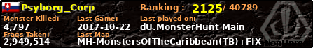 Psyborg_Corp | | PlayerID: | 30193 | | Overall MHT: | 2,949,514 | | Overall Deaths: | 445 | | Overall Suicides: | 3 | | Overall TeamKills: | 1 | | Overall Distance traveled: | 412km | | Overall Time Spend on Server: | 01days 06h 59m 15s | | Maps Played: | 158 | | Firstgame: | 2017-07-10 21:09:14 | | LastGame: | 2017-10-22 12:24:41 | | Player Ranking Place: | 2125 | | Used Playernames: | Psyborg_Corp