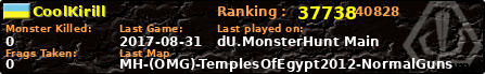 | Server | Map | LastGame | Score | Teamscore | Monsterleft | Deaths | Suicides | TKs | Distance | Playtime | |
