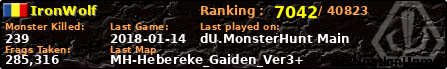 IronWolf | | PlayerID: | 30927 | | Overall MHT: | 285,316 | | Overall Deaths: | 62 | | Overall Suicides: | 0 | | Overall TeamKills: | 6 | | Overall Distance traveled: | 54km | | Overall Time Spend on Server: | 00days 04h 35m 21s | | Maps Played: | 15 | | Firstgame: | 2017-09-29 19:04:14 | | LastGame: | 2018-01-14 13:29:42 | | Player Ranking Place: | 7042 | | Used Playernames: | IronWolf