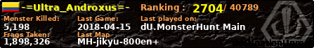 -=Ultra_Androxus=- | | PlayerID: | 31677 | | Overall MHT: | 1,898,326 | | Overall Deaths: | 529 | | Overall Suicides: | 21 | | Overall TeamKills: | 6 | | Overall Distance traveled: | 394km | | Overall Time Spend on Server: | 01days 12h 59m 51s | | Maps Played: | 115 | | Firstgame: | 2017-12-12 21:15:38 | | LastGame: | 2018-04-15 03:39:22 | | Player Ranking Place: | 2704 | | Used Playernames: | -=Ultra_Androxus=- *=_Ultra=Androxus_=* =ANDROXUS_LOQUILLO= **Prince_Androxus** $=ANDROXUS=$ *(SPD_ANDROXUS_SPD)*