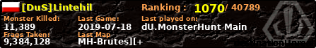 [DuS]Lintehil | | PlayerID: | 32816 | | Overall MHT: | 9,384,128 | | Overall Deaths: | 192 | | Overall Suicides: | 0 | | Overall TeamKills: | 5 | | Overall Distance traveled: | 334km | | Overall Time Spend on Server: | 01days 04h 46m 47s | | Maps Played: | 106 | | Firstgame: | 2018-03-12 10:24:26 | | LastGame: | 2019-07-18 09:09:28 | | Player Ranking Place: | 1070 | | Used Playernames: | [DuS]Lintehil