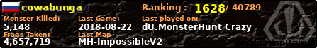 cowabunga | | PlayerID: | 33116 | | Overall MHT: | 4,657,719 | | Overall Deaths: | 734 | | Overall Suicides: | 2 | | Overall TeamKills: | 4 | | Overall Distance traveled: | 319km | | Overall Time Spend on Server: | 01days 15h 29m 34s | | Maps Played: | 144 | | Firstgame: | 2018-04-16 18:30:33 | | LastGame: | 2018-08-22 21:28:48 | | Player Ranking Place: | 1628 | | Used Playernames: | cowabunga