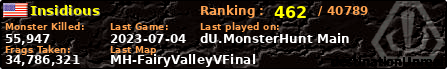 Insidious | | PlayerID: | 33378 | | Overall MHT: | 34,786,321 | | Overall Deaths: | 1244 | | Overall Suicides: | 33 | | Overall TeamKills: | 12 | | Overall Distance traveled: | 2,052km | | Overall Time Spend on Server: | 08days 05h 35m 11s | | Maps Played: | 803 | | Firstgame: | 2018-05-22 07:34:55 | | LastGame: | 2023-07-04 01:47:29 | | Player Ranking Place: | 462 | | Used Playernames: | Insidious BeemoZer0469 BeemoZer0 Beemo_the_Faithless BeemoLovesTobimasus :|:DarkBeemo:|: yourboibeemzzz *Supervixen* beemzzz yourboibeemz (:beemz:) Beemo Dragontooth beemz_xoxo lord_insidious ::SiD:: sid_the_kid beemz .::SiD::. .:SiD:. Cerulean_Testicles UltraInsidious Heartless-n-Sidious