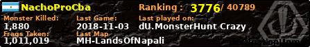 NachoProCba | | PlayerID: | 34210 | | Overall MHT: | 1,011,019 | | Overall Deaths: | 93 | | Overall Suicides: | 0 | | Overall TeamKills: | 1 | | Overall Distance traveled: | 130km | | Overall Time Spend on Server: | 00days 07h 55m 28s | | Maps Played: | 37 | | Firstgame: | 2018-09-22 01:29:10 | | LastGame: | 2018-11-03 20:09:36 | | Player Ranking Place: | 3776 | | Used Playernames: | NachoProCba