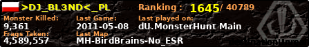 >DJ_BL3ND<_PL | | PlayerID: | 3669 | | Overall MHT: | 4,589,557 | | Overall Deaths: | 594 | | Overall Suicides: | 1 | | Overall TeamKills: | 6 | | Overall Distance traveled: | 569km | | Overall Time Spend on Server: | 01days 23h 04m 09s | | Maps Played: | 132 | | Firstgame: | 2011-03-16 05:58:57 | | LastGame: | 2011-05-08 05:42:39 | | Player Ranking Place: | 1645 | | Used Playernames: | >DJ_BL3ND<_PL GieKs@_PL