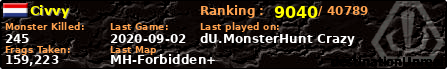 | MH-Forbidden+ | 2020-09-02 01:24:57 | 0 | 115048 | 83 | 0 | 0 | 0 | 0,00km | 00:02:32 | |