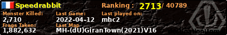 Speedrabbit | | PlayerID: | 38627 | | Overall MHT: | 1,882,632 | | Overall Deaths: | 212 | | Overall Suicides: | 4 | | Overall TeamKills: | 0 | | Overall Distance traveled: | 270km | | Overall Time Spend on Server: | 00days 23h 28m 15s | | Maps Played: | 54 | | Firstgame: | 2020-12-28 21:10:54 | | LastGame: | 2022-04-12 19:16:07 | | Player Ranking Place: | 2713 | | Used Playernames: | Speedrabbit