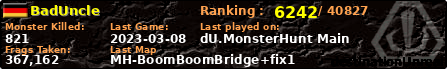 BadUncle | | PlayerID: | 38939 | | Overall MHT: | 367,162 | | Overall Deaths: | 96 | | Overall Suicides: | 1 | | Overall TeamKills: | 0 | | Overall Distance traveled: | 64km | | Overall Time Spend on Server: | 00days 04h 09m 39s | | Maps Played: | 16 | | Firstgame: | 2021-02-16 21:57:20 | | LastGame: | 2023-03-08 18:05:52 | | Player Ranking Place: | 6242 | | Used Playernames: | BadUncle