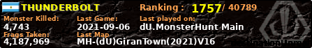 THUNDERBOLT | | PlayerID: | 39230 | | Overall MHT: | 4,187,969 | | Overall Deaths: | 211 | | Overall Suicides: | 6 | | Overall TeamKills: | 2 | | Overall Distance traveled: | 325km | | Overall Time Spend on Server: | 01days 08h 26m 24s | | Maps Played: | 115 | | Firstgame: | 2021-05-09 21:15:27 | | LastGame: | 2021-09-06 00:16:48 | | Player Ranking Place: | 1757 | | Used Playernames: | THUNDERBOLT