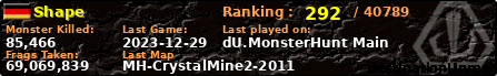 Shape | | PlayerID: | 55 | | Overall MHT: | 69,069,839 | | Overall Deaths: | 3457 | | Overall Suicides: | 75 | | Overall TeamKills: | 54 | | Overall Distance traveled: | 3,997km | | Overall Time Spend on Server: | 13days 05h 42m 58s | | Maps Played: | 1202 | | Firstgame: | 2010-08-03 22:54:47 | | LastGame: | 2023-12-29 23:47:22 | | Player Ranking Place: | 292 | | Used Playernames: | Shape Louvre