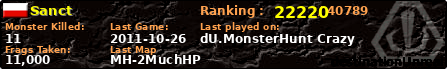 | MH-2MuchHP | 2011-10-26 19:11:40 | 7,920 | 596477 | 169 | 2 | 0 | 0 | 0,50km | 00:18:44 | |