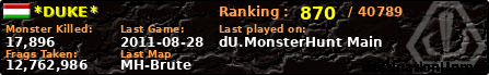 *DUKE* | | PlayerID: | 687 | | Overall MHT: | 12,762,986 | | Overall Deaths: | 888 | | Overall Suicides: | 4 | | Overall TeamKills: | 10 | | Overall Distance traveled: | 1,294km | | Overall Time Spend on Server: | 03days 21h 03m 55s | | Maps Played: | 266 | | Firstgame: | 2010-08-17 23:42:42 | | LastGame: | 2011-08-28 14:46:04 | | Player Ranking Place: | 870 | | Used Playernames: | *DUKE* *L*A*R*A* MiSS_NiCE_ASS (:CHICK:)