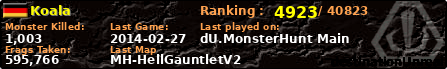 Koala | | PlayerID: | 731 | | Overall MHT: | 595,766 | | Overall Deaths: | 43 | | Overall Suicides: | 0 | | Overall TeamKills: | 0 | | Overall Distance traveled: | 65km | | Overall Time Spend on Server: | 00days 06h 46m 10s | | Maps Played: | 29 | | Firstgame: | 2010-08-19 19:31:37 | | LastGame: | 2014-02-27 23:32:25 | | Player Ranking Place: | 4923 | | Used Playernames: | Koala
