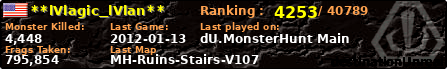 **lVlagic_lVlan** | | PlayerID: | 7458 | | Overall MHT: | 795,854 | | Overall Deaths: | 275 | | Overall Suicides: | 1 | | Overall TeamKills: | 0 | | Overall Distance traveled: | 171km | | Overall Time Spend on Server: | 00days 14h 01m 05s | | Maps Played: | 34 | | Firstgame: | 2011-12-10 02:14:09 | | LastGame: | 2012-01-13 06:14:11 | | Player Ranking Place: | 4253 | | Used Playernames: | **lVlagic_lVlan** lVlR.l3ullets