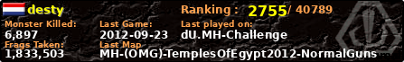 desty | | PlayerID: | 7676 | | Overall MHT: | 1,833,503 | | Overall Deaths: | 536 | | Overall Suicides: | 0 | | Overall TeamKills: | 2 | | Overall Distance traveled: | 379km | | Overall Time Spend on Server: | 01days 10h 32m 21s | | Maps Played: | 50 | | Firstgame: | 2011-12-24 15:34:42 | | LastGame: | 2012-09-23 19:31:11 | | Player Ranking Place: | 2755 | | Used Playernames: | desty