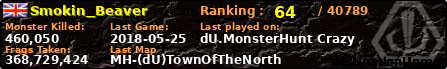 Smokin_Beaver | | PlayerID: | 8086 | | Overall MHT: | 368,729,424 | | Overall Deaths: | 11907 | | Overall Suicides: | 1389 | | Overall TeamKills: | 105 | | Overall Distance traveled: | 12,668km | | Overall Time Spend on Server: | 43days 06h 43m 25s | | Maps Played: | 3668 | | Firstgame: | 2012-01-18 16:11:11 | | LastGame: | 2018-05-25 19:16:07 | | Player Ranking Place: | 64 | | Used Playernames: | Smokin_Beaver Smokin_Beaver_ uyi_ Hairy_Pornstar