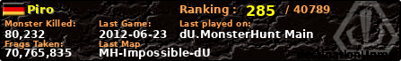 Piro | | PlayerID: | 8219 | | Overall MHT: | 70,765,835 | | Overall Deaths: | 2477 | | Overall Suicides: | 66 | | Overall TeamKills: | 65 | | Overall Distance traveled: | 3,481km | | Overall Time Spend on Server: | 13days 04h 13m 16s | | Maps Played: | 939 | | Firstgame: | 2012-01-27 22:23:28 | | LastGame: | 2012-06-23 19:45:50 | | Player Ranking Place: | 285 | | Used Playernames: | Piro