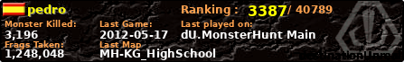 pedro | | PlayerID: | 8586 | | Overall MHT: | 1,248,048 | | Overall Deaths: | 549 | | Overall Suicides: | 2 | | Overall TeamKills: | 1 | | Overall Distance traveled: | 398km | | Overall Time Spend on Server: | 01days 03h 50m 07s | | Maps Played: | 86 | | Firstgame: | 2012-02-25 05:48:34 | | LastGame: | 2012-05-17 03:38:06 | | Player Ranking Place: | 3387 | | Used Playernames: | pedro