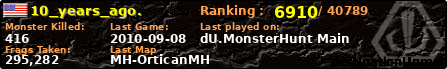 10_years_ago. | | PlayerID: | 926 | | Overall MHT: | 295,282 | | Overall Deaths: | 74 | | Overall Suicides: | 0 | | Overall TeamKills: | 0 | | Overall Distance traveled: | 57km | | Overall Time Spend on Server: | 00days 04h 25m 13s | | Maps Played: | 20 | | Firstgame: | 2010-08-28 00:47:05 | | LastGame: | 2010-09-08 20:22:30 | | Player Ranking Place: | 6910 | | Used Playernames: | 10_years_ago.