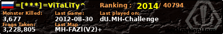=[***]=ViTaLiTy^ | | PlayerID: | 10824 | | Overall MHT: | 3,228,805 | | Overall Deaths: | 79 | | Overall Suicides: | 2 | | Overall TeamKills: | 1 | | Overall Distance traveled: | 131km | | Overall Time Spend on Server: | 00days 12h 38m 26s | | Maps Played: | 35 | | Firstgame: | 2012-08-23 00:44:26 | | LastGame: | 2012-08-30 22:06:58 | | Player Ranking Place: | 2014 | | Used Playernames: | =[***]=ViTaLiTy^ HAPPY_BIRTHDAY_TO_ME =[***]=Vi´TaLiT´y// =[***]= =[***]=^..^= B@D_BuTa/uK