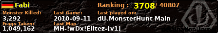 Fabi | | PlayerID: | 1087 | | Overall MHT: | 1,049,162 | | Overall Deaths: | 507 | | Overall Suicides: | 0 | | Overall TeamKills: | 5 | | Overall Distance traveled: | 255km | | Overall Time Spend on Server: | 00days 16h 30m 27s | | Maps Played: | 48 | | Firstgame: | 2010-09-04 20:18:36 | | LastGame: | 2010-09-11 13:19:43 | | Player Ranking Place: | 3708 | | Used Playernames: | Fabi