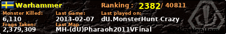 Warhammer | | PlayerID: | 11144 | | Overall MHT: | 2,379,309 | | Overall Deaths: | 218 | | Overall Suicides: | 2 | | Overall TeamKills: | 0 | | Overall Distance traveled: | 206km | | Overall Time Spend on Server: | 00days 15h 35m 23s | | Maps Played: | 37 | | Firstgame: | 2012-09-12 20:46:38 | | LastGame: | 2013-02-07 21:05:32 | | Player Ranking Place: | 2382 | | Used Playernames: | Warhammer