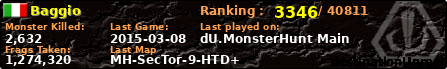 Baggio | | PlayerID: | 11282 | | Overall MHT: | 1,274,320 | | Overall Deaths: | 275 | | Overall Suicides: | 0 | | Overall TeamKills: | 0 | | Overall Distance traveled: | 168km | | Overall Time Spend on Server: | 00days 12h 36m 48s | | Maps Played: | 35 | | Firstgame: | 2012-09-28 15:07:04 | | LastGame: | 2015-03-08 19:36:51 | | Player Ranking Place: | 3346 | | Used Playernames: | Baggio