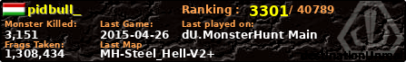 pidbull_ | | PlayerID: | 11359 | | Overall MHT: | 1,308,434 | | Overall Deaths: | 168 | | Overall Suicides: | 14 | | Overall TeamKills: | 2 | | Overall Distance traveled: | 151km | | Overall Time Spend on Server: | 00days 13h 35m 57s | | Maps Played: | 38 | | Firstgame: | 2012-10-06 10:21:46 | | LastGame: | 2015-04-26 12:58:14 | | Player Ranking Place: | 3301 | | Used Playernames: | pidbull_ Harcosking karlosz pitbul