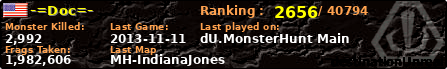-=Doc=- | | PlayerID: | 11767 | | Overall MHT: | 1,982,606 | | Overall Deaths: | 136 | | Overall Suicides: | 1 | | Overall TeamKills: | 0 | | Overall Distance traveled: | 162km | | Overall Time Spend on Server: | 00days 16h 31m 37s | | Maps Played: | 47 | | Firstgame: | 2012-11-10 00:57:34 | | LastGame: | 2013-11-11 01:21:11 | | Player Ranking Place: | 2656 | | Used Playernames: | -=Doc=- Doc