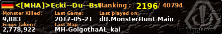 <[MHA]>Ecki--Du--Bst | | PlayerID: | 11817 | | Overall MHT: | 2,778,922 | | Overall Deaths: | 750 | | Overall Suicides: | 0 | | Overall TeamKills: | 5 | | Overall Distance traveled: | 510km | | Overall Time Spend on Server: | 01days 23h 29m 54s | | Maps Played: | 145 | | Firstgame: | 2012-11-13 18:43:48 | | LastGame: | 2017-05-21 08:27:57 | | Player Ranking Place: | 2196 | | Used Playernames: | <[MHA]>Ecki--Du--Bst Ecki--Du--Bist--Mir
