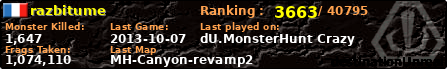 razbitume | | PlayerID: | 11846 | | Overall MHT: | 1,074,110 | | Overall Deaths: | 102 | | Overall Suicides: | 0 | | Overall TeamKills: | 0 | | Overall Distance traveled: | 76km | | Overall Time Spend on Server: | 00days 08h 14m 24s | | Maps Played: | 19 | | Firstgame: | 2012-11-16 22:40:31 | | LastGame: | 2013-10-07 23:08:36 | | Player Ranking Place: | 3663 | | Used Playernames: | razbitume