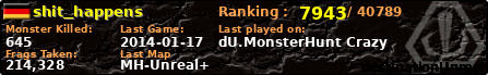 shit_happens | | PlayerID: | 12779 | | Overall MHT: | 214,328 | | Overall Deaths: | 172 | | Overall Suicides: | 0 | | Overall TeamKills: | 0 | | Overall Distance traveled: | 82km | | Overall Time Spend on Server: | 00days 06h 13m 22s | | Maps Played: | 23 | | Firstgame: | 2013-02-10 16:24:44 | | LastGame: | 2014-01-17 12:42:48 | | Player Ranking Place: | 7943 | | Used Playernames: | shit_happens