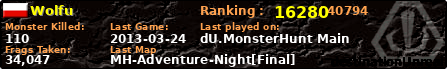 | Server | Map | LastGame | Score | Teamscore | Monsterleft | Deaths | Suicides | TKs | Distance | Playtime | |